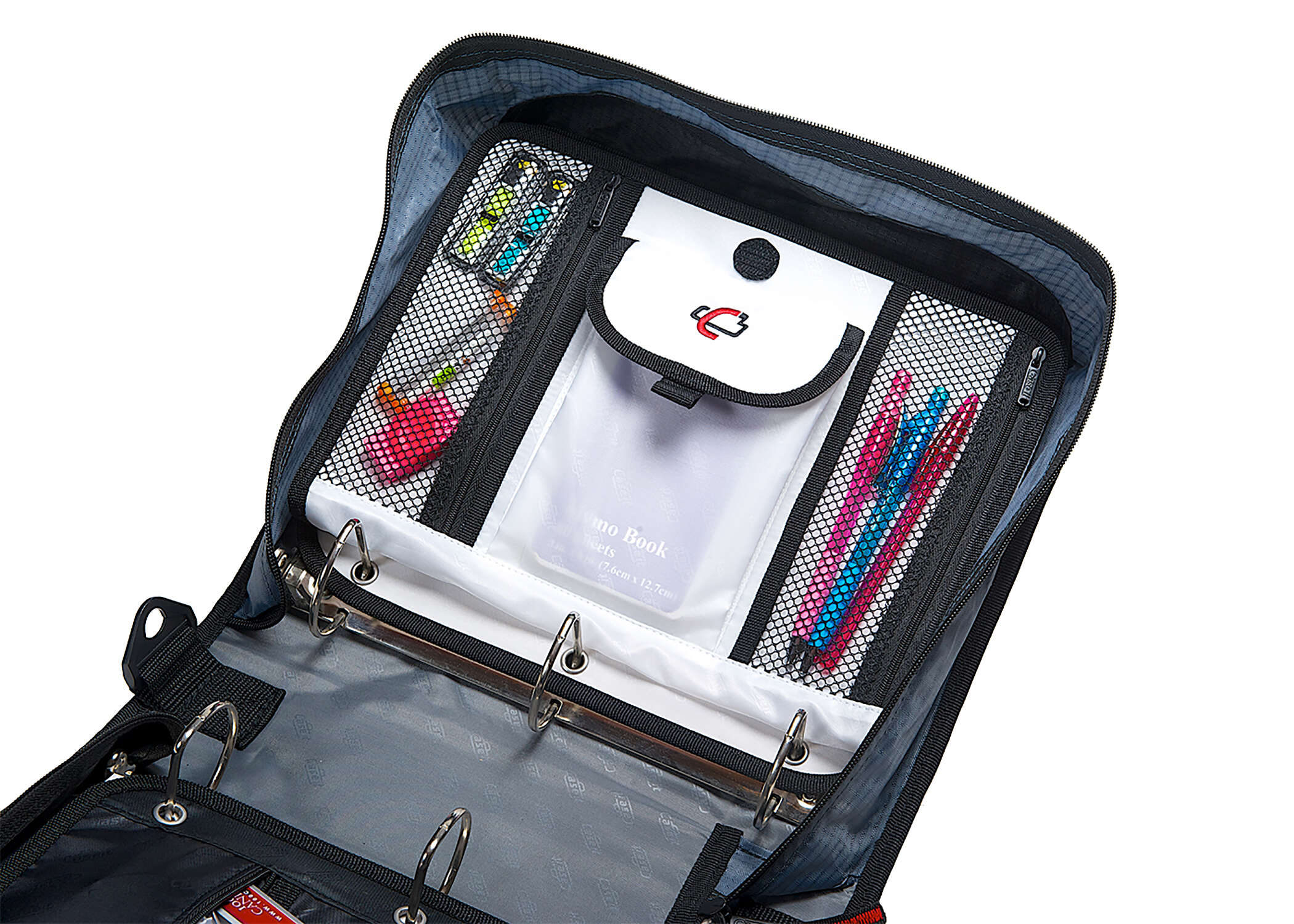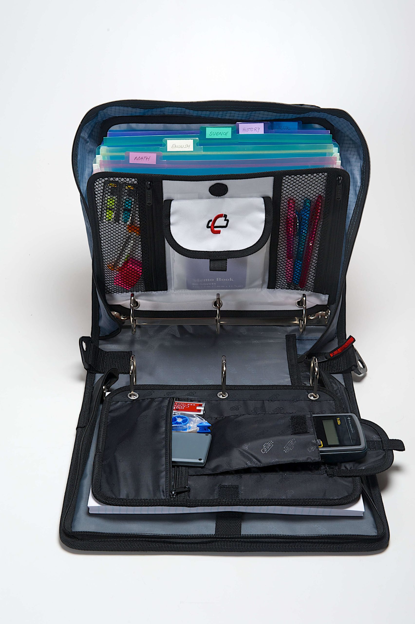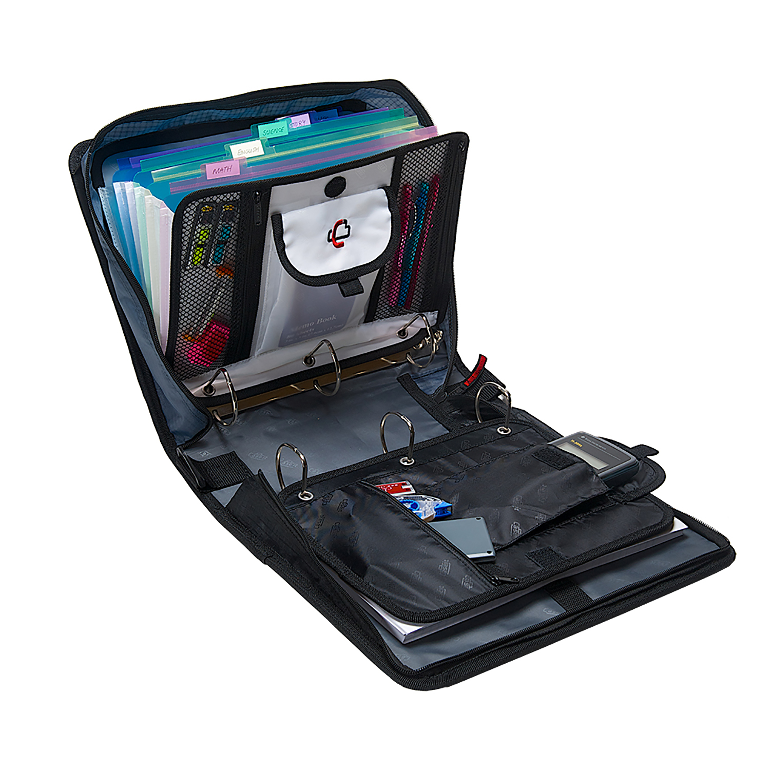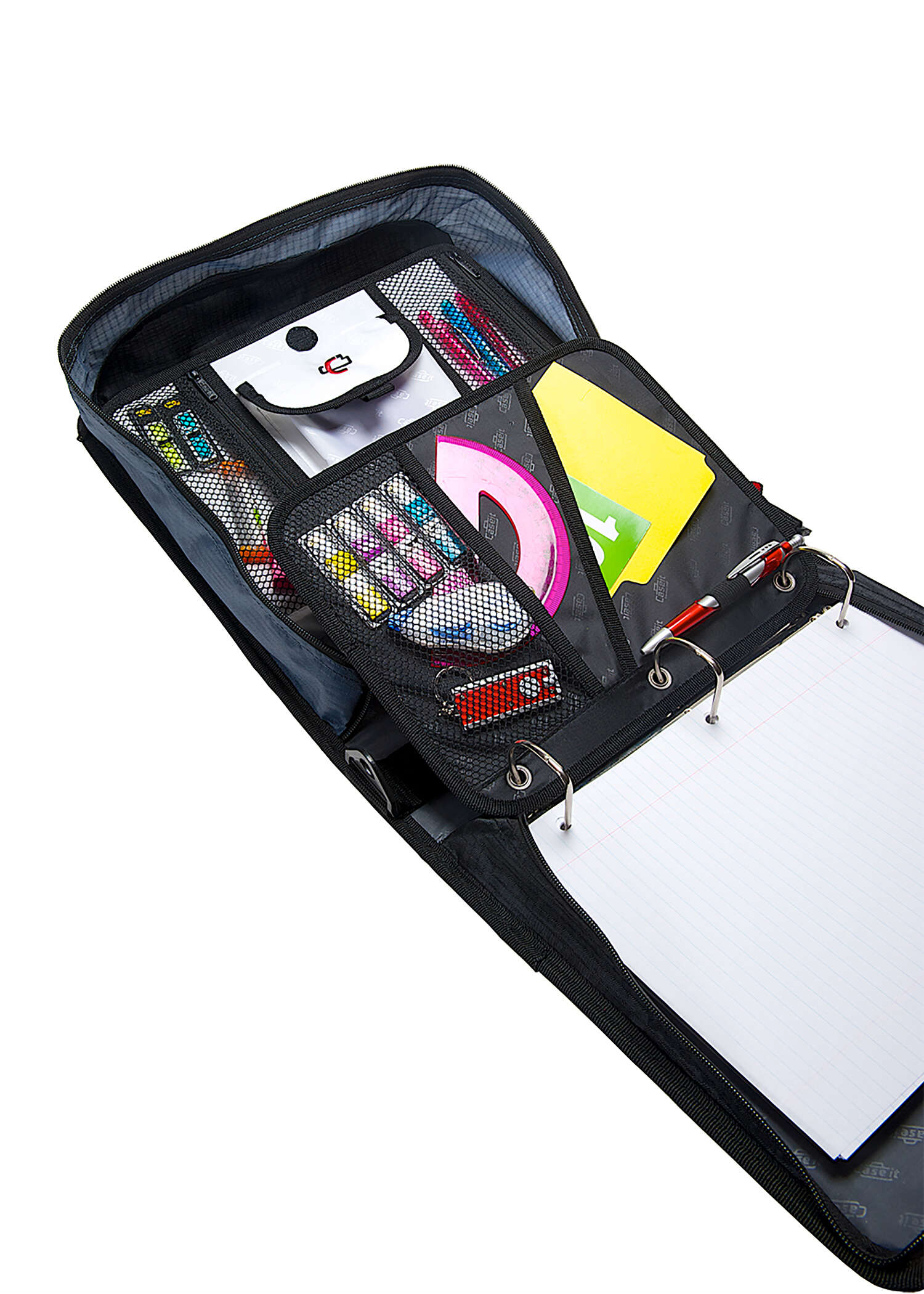 The Case-it Dual 2.0 Zipper Binder has two separate sets of rings, for a total storage space equivalent to a 4-inch binder. This binder can hold up to 800 sheets of paper! Each set of rings is seperated for easy organization and reference. The “hold down pages” keep all of your papers secure to their side like paper weights. They even provide extra storage for your writing tools! This practical zipper binder closes completely to protect the contents from falling out or getting damaged. Easily take your school work home with you because every Dual 2.0 comes with a “hold down page” that doubles as a removable 5 Subject expanding file folder. Its shoulder strap or handle make the binder easy to carry from school to home or class to class.
