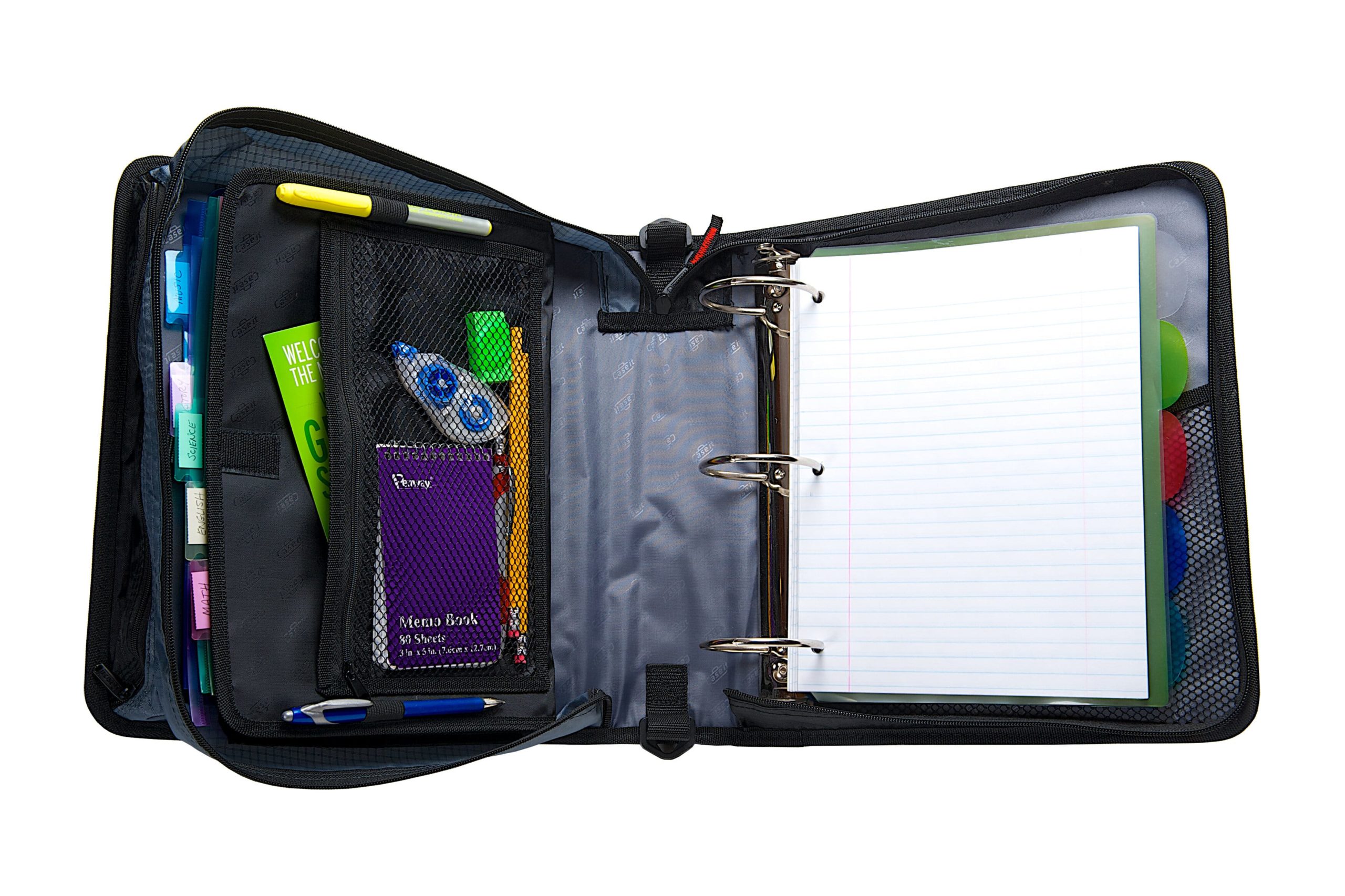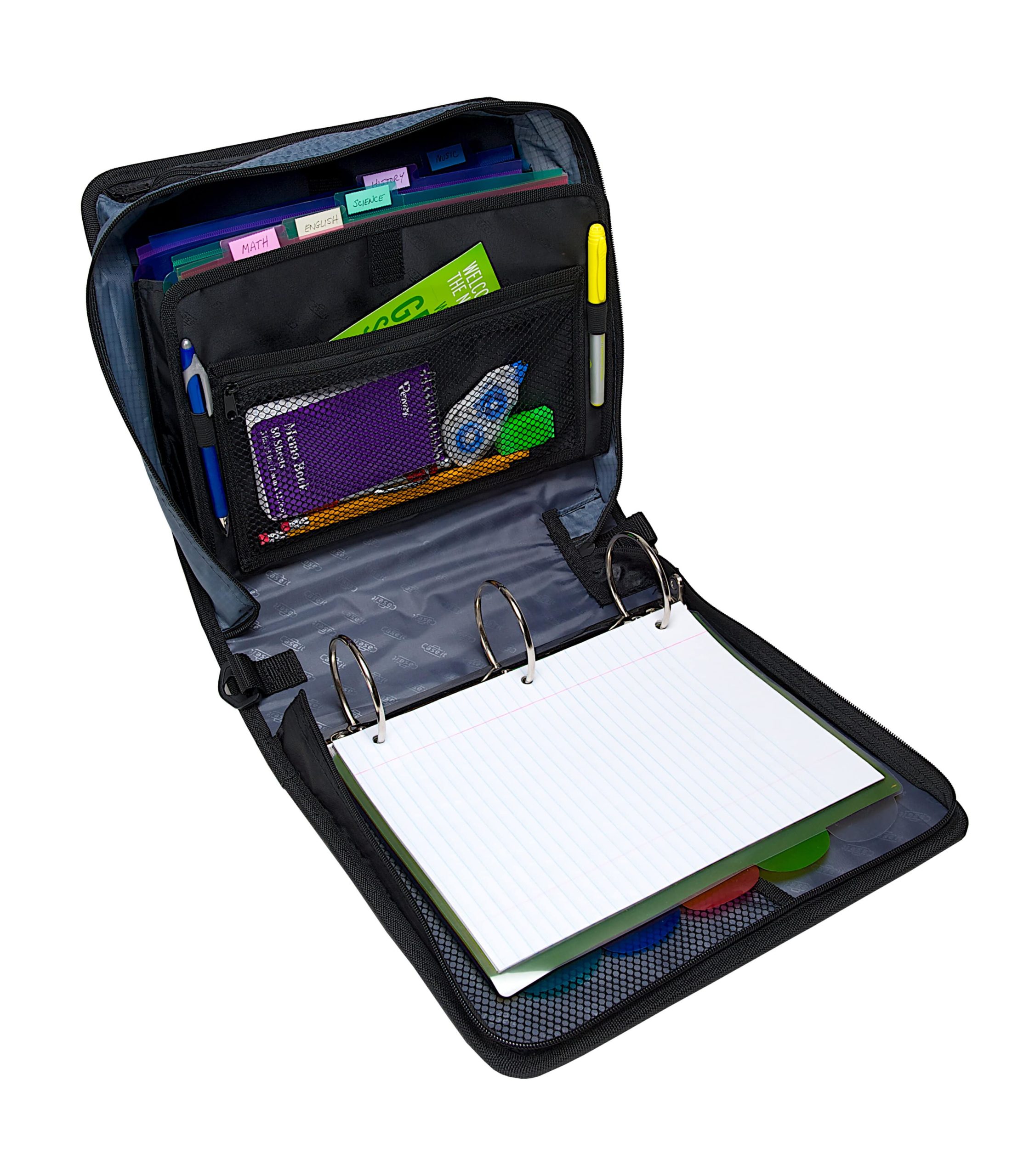 Keep yourself organized and your papers protected in the Case-it 3 Inch Mighty Zip Tab Zipper Binder. The Mighty Zip tab has standard ring size of 3 inches that holds up to 600 sheets. With that much room, keeping up with all of your classes is a breeze! For even more organization this binder comes with an expanding file folder that helps you separate 5 subjects easily. Access your files easily when the binder is closed with the patented U-shaped opening on the gusset. With no shortage of interior and exterior zippered pockets you can keep more items contained in one place. The exterior zipper pocket is great for storing a couple of pencils or pens for quick access. Keep your schoolwork from falling out or getting damaged with our durable zippered gussets. The zippers are self correcting too! Just slide them all the way back down the gusset and they will fix themselves. Conveniently the gusset is made with a ripstop material that keep tears from spreading. Take your classroom with you with the handle and shoulder strap that comes included.