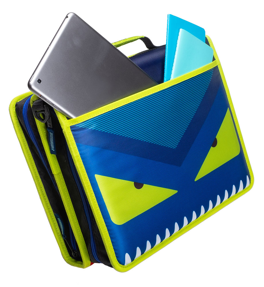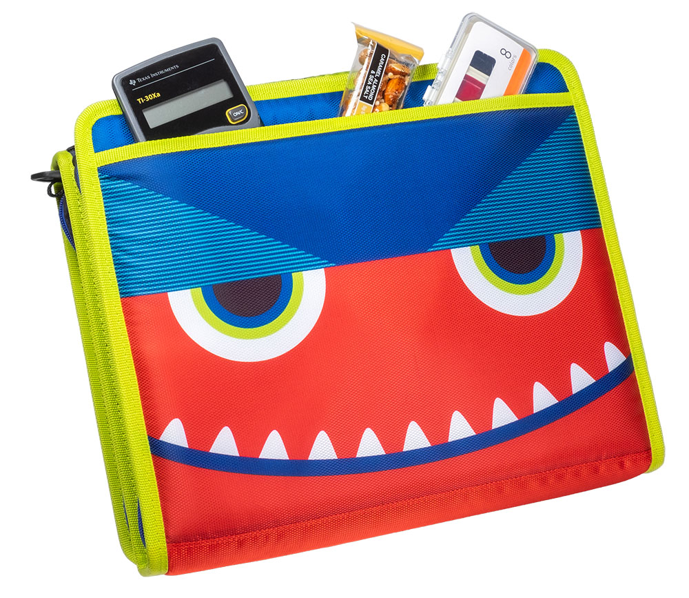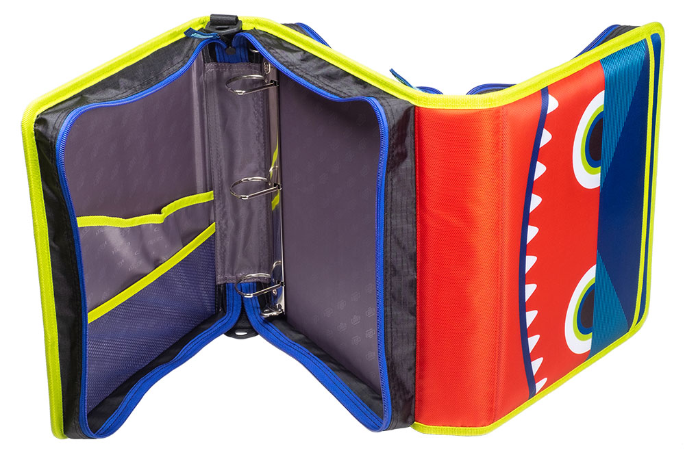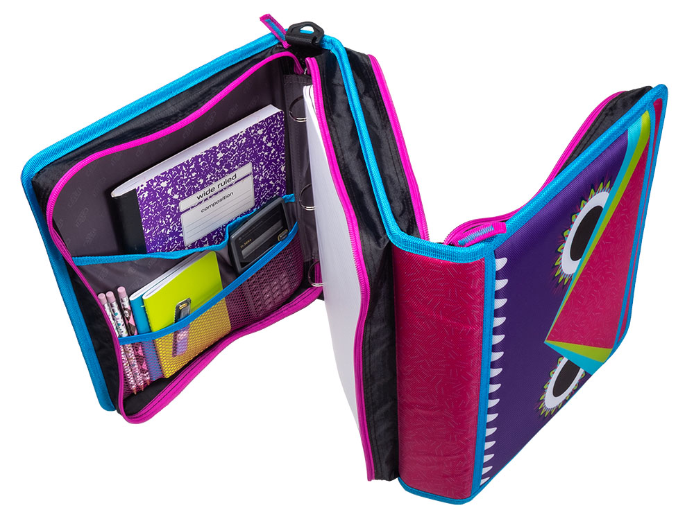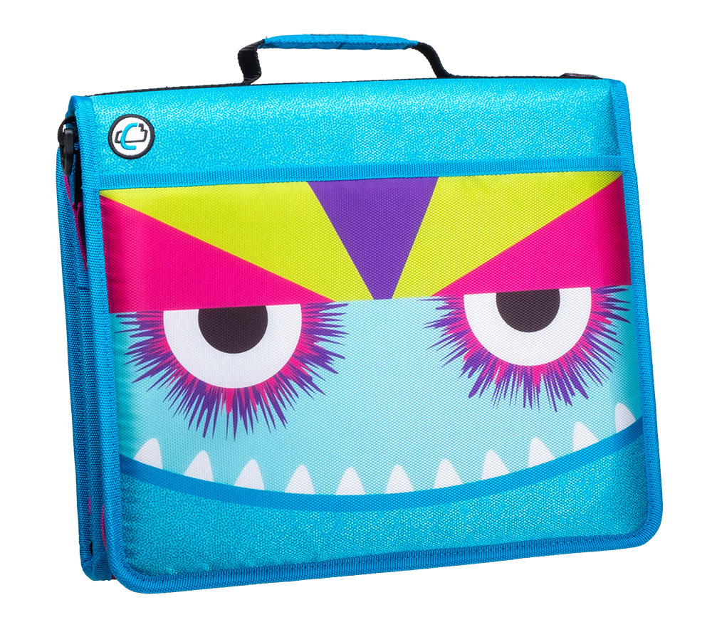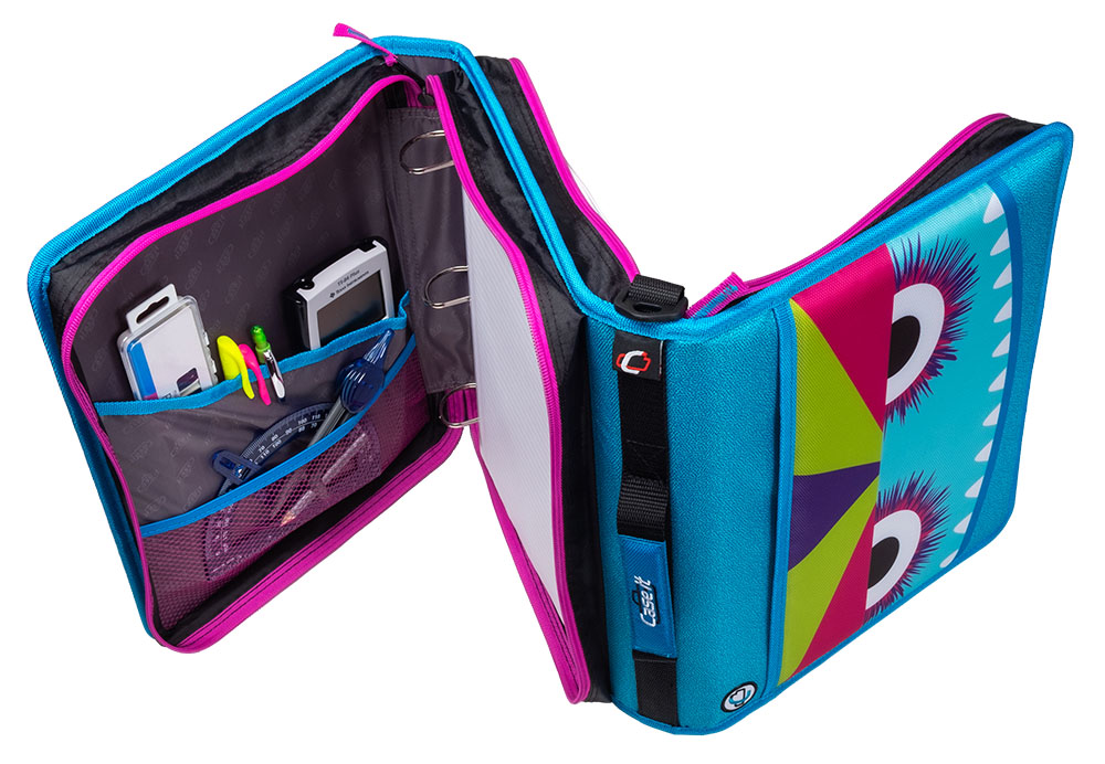 The Case-it “Z” Monster Zipper Binder keeps you ultra-organized at school. Pick your favorite Monster and hit the ground running, The Z Monster binder features an innovative 2-in-1 design that keeps important documents and items organized for easy reference. The “Z” shape features interior and exterior pockets on both sides to double your storage capacity. Use this specialty binder for holding notebooks, pens, calculators, rulers and more. Each section has its own set of 1.5″ D-rings that each hold a 250 sheet capacity, for a combined total of 500 sheet capacity. The durable zipper closure is ideal for keeping your documents safe from falling out or getting damaged. Conveniently the gusset is made with a ripstop material that keep tears from spreading. Does you want to seperate your subjects by class periods? The two-sided design allows you to use each side for specific subjects – giving you the freedom to get organized how you want. For transporting to and from class use the handle or shoulder strap provided.